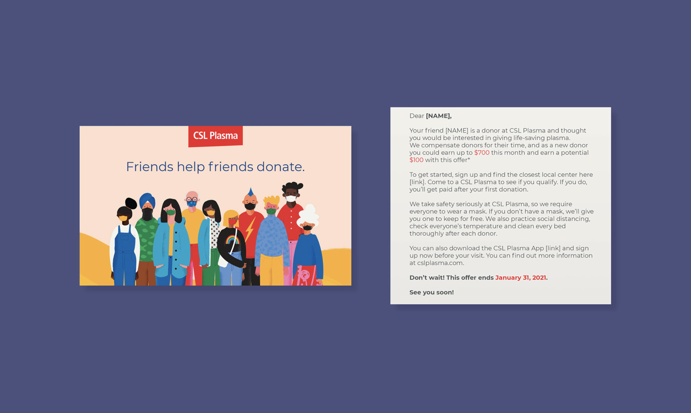 Our campaign was launched during COVID-19, so we needed to ensure there was proper safety messaging everywhere. We built custom designs for postcards, e-mails, signage, and more.